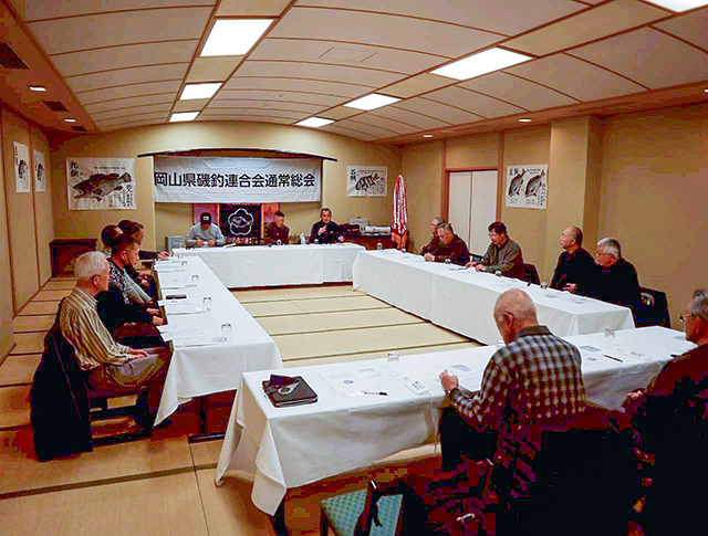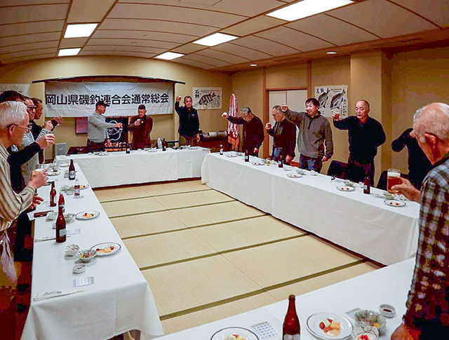 令和8年1月25日(日) 岡山県磯釣連合会は岡山北区のサンピーチOKAYAMAにおいて、令和8年度通常総会を開催し、令和7年度事業報告や会計報告、令和8年度事業計画や予算等について協議を行った。また、会議終了後には懇親会を催し、会員相互の親睦を図った。
