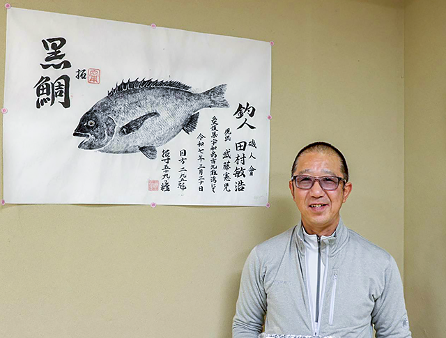 【年間大物賞 チヌの部優勝 磯人會 田村氏と魚拓】