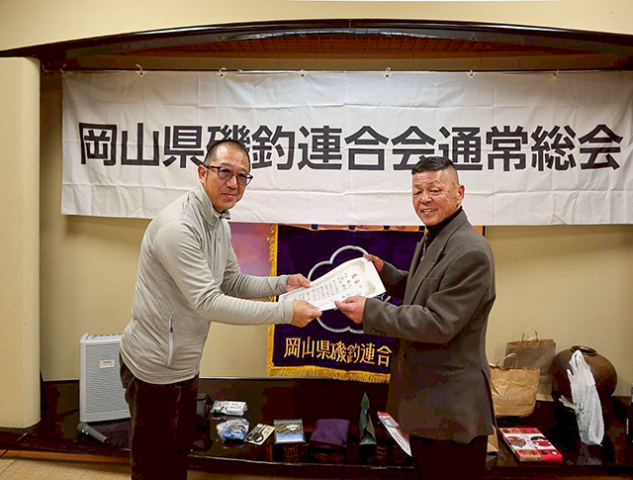 【県連旗返還及び授与 岡山磯釣りクラブ 河合会長(右)から岡山総磯会 片岡会長(左)へ】
